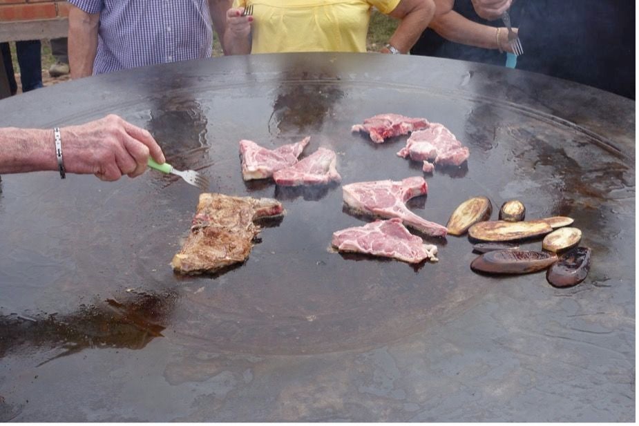 We hadden ons aangemeld voor de kamelen-barbecue. Ongeveer in het midden van de camping is een stook- en ontmoetingsplaats. De barbecue is eigenlijk een grote ronde ijzeren plaat van een centimeter dik, met daaronder de gasvlam. Rond het middaguur werd de plaat heet gestookt en kon het uitdelen van de kamelenkarbonades beginnen. Een gepofte aardappel er bij en wat saus. Met z’n allen rond de plaat en bakken maar. Een mandarijntje een paar Marokkaanse koekjes als toetje. Het smaakte goed en het was erg gezellig.
