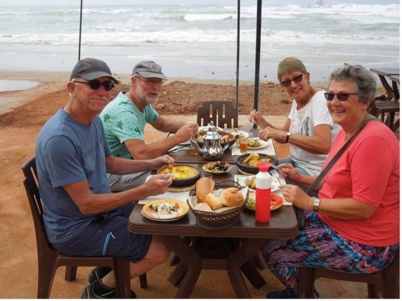 In het verslag van gisteren hadden we al aangegeven dat er vandaag om twaalf uur ‘iets te nuttigen zou zijn’. De campingbaas en z’n vrouw hadden voor iedereen voor een hapje en een drankje gezorgd. Sangria en heerlijke platte koekjes met tappenade, stukjes pizza ter grote van een luciferdoosje en iets van gevulde aubergines. Alle campinggasten waren aanwezig, het overgrote deel was (en sprak natuurlijk) Frans. Wij waren gelukkig met z’n vieren en een Duits echtpaar sloot zich bij ons aan. Maar later wilde hij dat wij hun fotoboeken van vorige Marokkoreizen bekeken. Wij moesten helaas weer aan de klus.