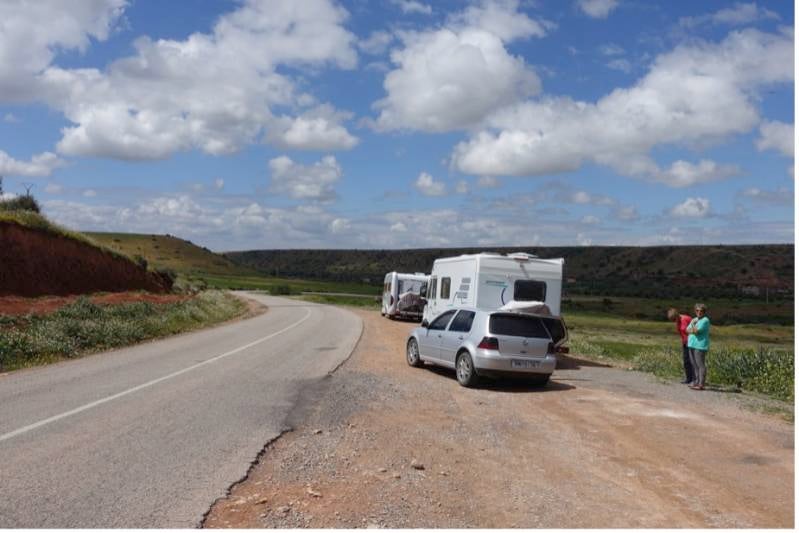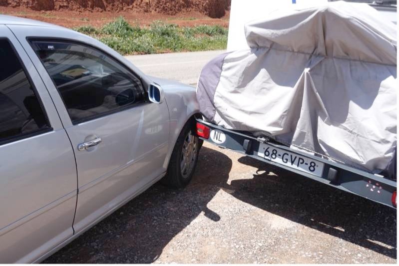 Een paar meter achter de camper was een tijdje geleden een Volkswagen met drie personen gaan staan. Ze waren het veld in gelopen en de auto was, mogelijk door een windvlaag van een langsrijdende vrachtwagen, gaan rijden op de iets hellende parkeerplaats. En een rijdende massa van 1000 kilogram over een paar meter komt toch nog wel hard aan. We hebben de eigenaren uit het veld teruggeroepen. Hij zei dat de auto wel op de handrem stond. Waar hadden we dat ook al eerder gehoord. Inderdaad, dit was de tweede keer. Kort en goed, de lichtbalk was zodanig verbogen dat die moet worden vernieuwd. We wilden gelijk afrekenen, we wisten dat de prijs ongeveer €185.- was. Maar meneer had niet meer dan een tientje bij zich en hij woonde in Casablanca, ook niet direct naast de deur. We zeiden dat hij dan maar de politie moest bellen. En hij heeft wat staan bellen, kwam steeds met andere verhalen aanzetten en ze gingen intussen nog maar even een stukje wandelen, want de politie kwam er aan en dan waren ze zo terug bij de auto. Wij hebben toen SOS-International gebeld en advies gevraagd. Ons werd aangeraden het Europese schadeformulier samen in te vullen en een proces verbaal te laten opmaken door de politie. Ook heeft de medewerker van SOS met de veroorzaker van de schade gesproken, het gesprek is opgenomen en er is een dossier gemaakt. Het invullen van het schadeformulier werd een ware martelgang en is maar deels gelukt. Het formulier, en dus de vragen zijn in het Nederlands. En hij sprak Frans en een beetje Engels, maar als het er op aankwam begreep hij het niet. Gelukkig hadden we ook een gesealde Franse versie bij ons. Zodoende kon hij dus toch de vragen invullen. Tenminste dat dachten wij en wij hadden ons deel al klaar. Hij ging schoorvoetend bezig, naar later bleek heeft zijn vriendin dat gedaan. Tot op zeker moment: “heeft u nog zo’n formulier, want ik heb iets fout gedaan”. Nee, dat hadden we niet! Hij was intussen aldoor aan het bellen en vertelde dat de gendarme zou komen, dat ze niet zouden komen, dat ze geen tijd hadden, dat ze niet wisten waar we stonden en dat we maar naar hen toe moesten komen. Wij hebben de man uitgelegd dat dat allemaal niet nodig was als hij het formulier maar verder invulde. Hij ging weer bellen en er kwam een vrachtwagenchauffeur die wel wilde proberen de lichtbalk weer recht te buigen: “afblijven!” Voor Marokkaanse begrippen is dit een schade van niks. Hij ging weer bellen: we moesten toch naar de politie en dan kon hij daar het formulier verder invullen. Wij drongen aan dat dat niet nodig was als hij maar op het formulier aangaf hoeveel kruisjes op zijn deel waren gezet en z’n handtekening. De Franse vertaling lieten we hem weer zien: “dat begrijp ik niet” was zijn commentaar. Bellen. Nieuw voorstel: we rijden naar het volgende dorp en dan kopiëren we het formulier en de wederzijdse kentekenbewijzen. Nou, vooruit dan maar. Want we waren inmiddels al ruim twee uren verder. We reden achter hun aan en hij stopte op een parking in het volgende dorp. Hij uit de auto, ik ook. En hij, hij belde alweer en wenkte dat we nog verder moesten. Daarna hebben we hem niet meer gezien. Hij is gevlucht en dat staat op de dashcam, we weten niet of we er nog iets mee kunnen en/of moeten doen. En naar wij denken heeft hij al die tijd gebeld met Joost mag weten wie, maar vast niet met de politie en een mogelijkheid gezocht om ons kwijt te raken. Gelukkig waren C&W bij ons als getuige en voor morele steun!
