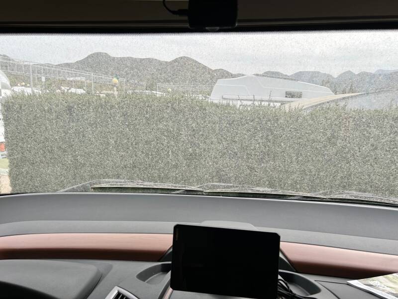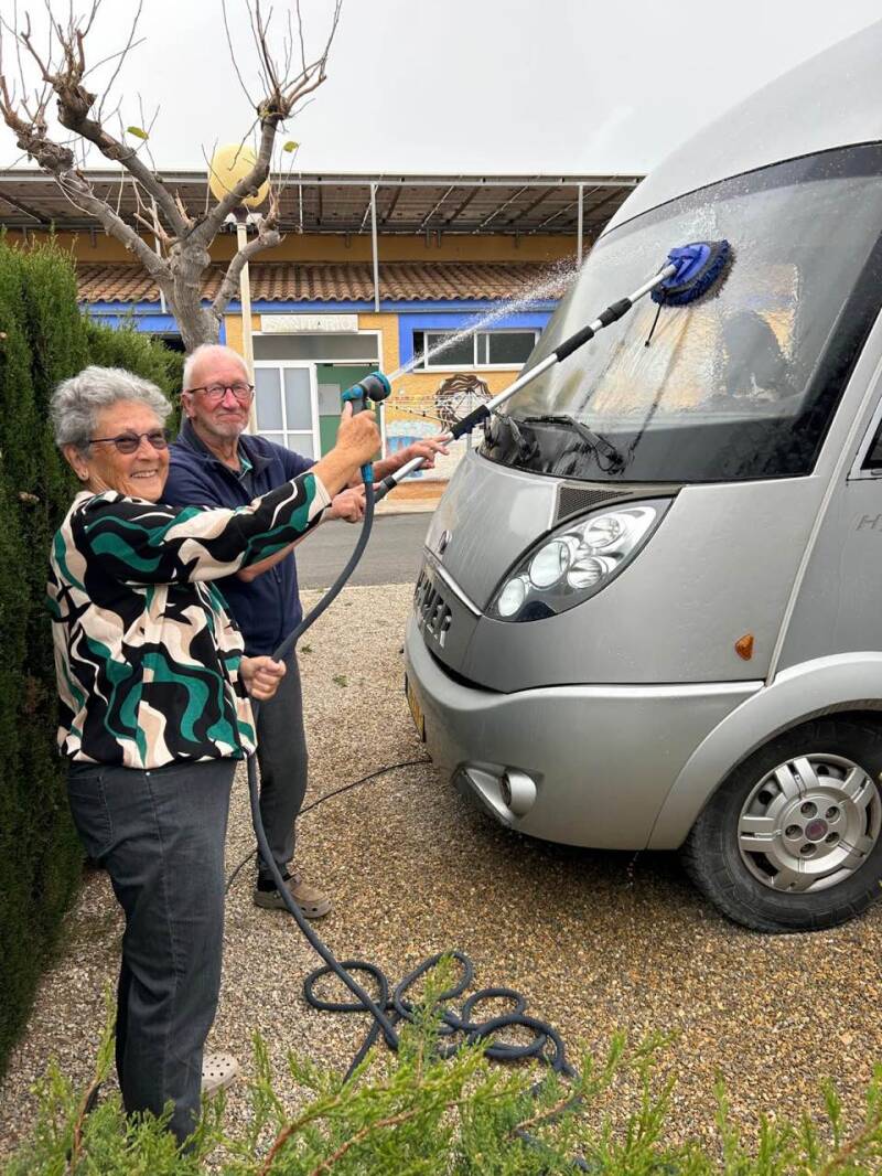 Onze camperbuurman had net de eigen camper van het meeste Saharazand ontdaan en bood daarna ons de waterslang aan. We hebben niet alles kunnen verwijderen, maar de voorruit is gelukkig weer transparant.