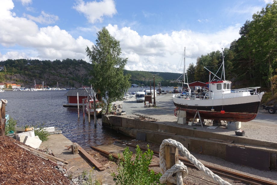 We zijn naar wegnummer 21 gegaan, verder zuidwaarts. Een goede route, soms een beetje saai. Weinig langs het water gereden, meer langs beboste omgeving. De weg zelf vereiste alle alertheid vanwege de vele bochten en heuvels en dalen. Het was soms net een achtbaan, maar in deze kon je wél zelf sturen. Om drie uur waren we in Halden. Een cp aan de rommelige jachthaven. Er was geen mogelijkheid om het vuilwater en de toilettank te legen. Hier hebben we voor ’t eerst onze reserve toilettank moeten gebruiken.