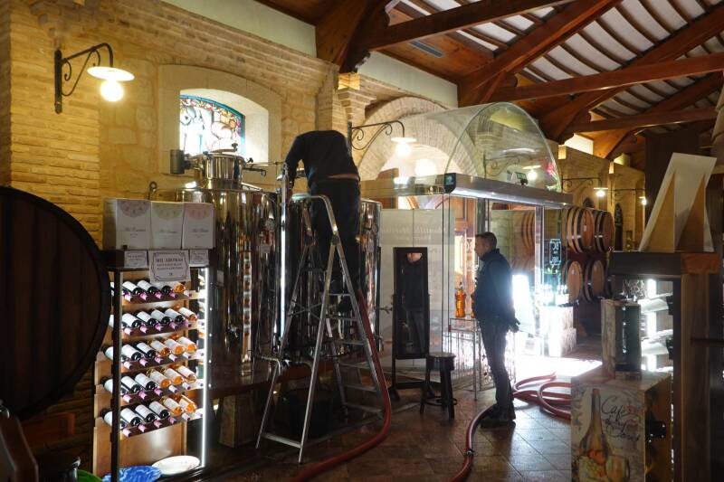 Vanochtend kwam Kees vragen of we zin hadden om mee te gaan naar Hondon. Om twaalf uur zijn we met z’n achten op de fiets gestapt. Het was een ritje van bijna 7 kilometer. We hebben de fietsen vooraan in het dorp aan een hek gezet en het eerste doel was een bezoek aan de Bodega. Nadat we daar wat hadden rondgelopen, werd het idee van een (kleine) wijnproeverij voorgesteld. Buiten hadden we de keuze voor een tafeltje ín of úit de zon en even later werden de wijnglazen op tafel gezet. We waren met z’n achten, dus dat werd een tafel vol glas. Tweeëndertig om precies te zijn. We proefden twee witte wijnen en twee rode. En als afsluiting namen we nog een kleine jerrycan van twee liter rode wijn mee, en een flesje speciale olijfolie.