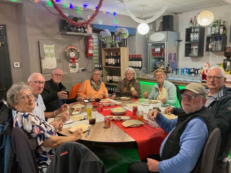 Om de tijd te doden tot aan het magische uur van de overgang van 2024 naar 2025 was door G&D een quiz georganiseerd die bestond uit 24 vragen, verdeeld over de avond en afgewisseld met gezellige kletserij over van alles en nog wat. De vragen waren zeer divers van aard. Van muziekfragmenten waarvan de titel en uitvoerder moest worden geraden, tot aan het benoemen van de supermarkten in Aspe, de plaatsnamen van de dorpjes rondom de cp en de betekenis van de letters op de afstandsbediening van de elektrische toegangspoort. Al met al soms best lastig. Want ja, hoe heette nou die supermarkt waar we níet naar toe gingen maar er wél langs fietsten op weg naar de supermarkt Mercadona. Wij vielen niet in de prijzen, hetgeen volledig in overeenstemming was met ons voorgevoel. Maar voor alle verliezers was er een flesje met de eigen olijfolie van HKH.