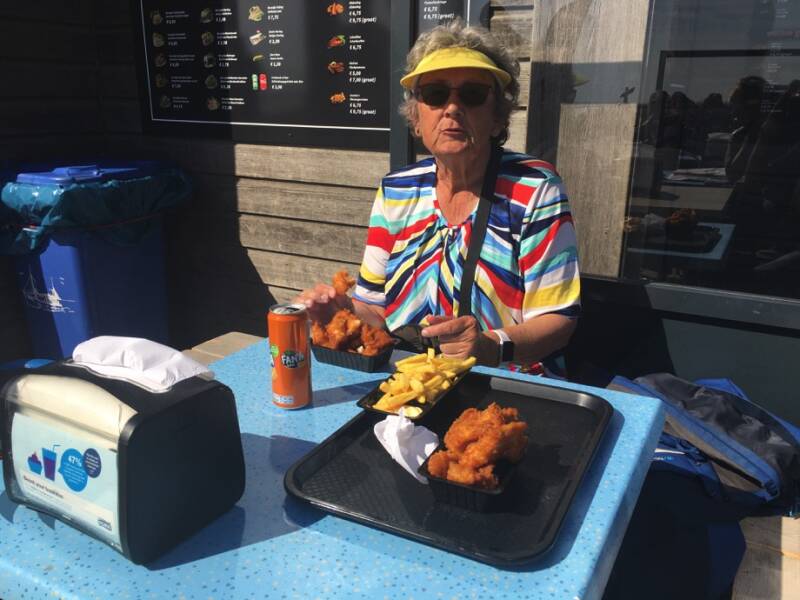 Het einde van de fietstocht voerde ons naar de boulevard. We hebben daar op een terrasje kibbeling gegeten. Grote brokken vis, maar tamelijk vet. We zijn verwend met de plates die we jarenlang tijdens kerst en de jaarwisseling in Scheveningen aten.