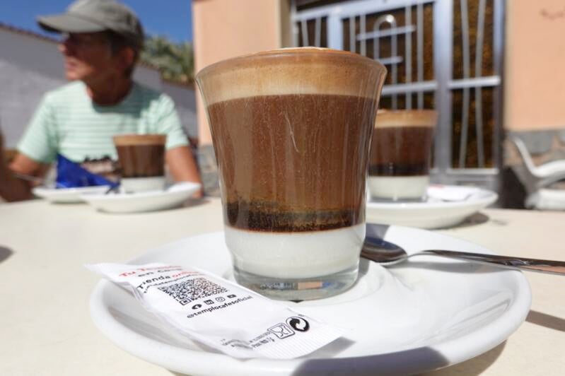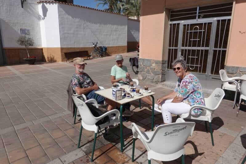 We zijn hetzelfde pad teruggefietst en voelden dat er ter hoogte van het Local Social in Isla Plana als het ware een kracht naar links op de fietsen werd uitgeoefend. We hebben hier maar aan toegegeven en vonden nog een vrij tafeltje in de zon. Voor Margot een groot glas Sangria en een Café Asiático voor Gerard, vergezeld door wat lekkers.