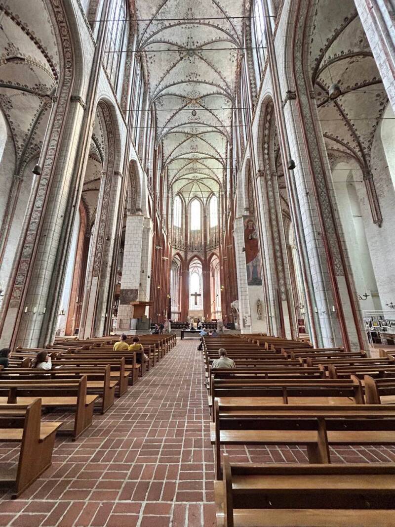 Onze tweede kerk was De Mariakerk, alleen te bezoeken nadat je de nodige Euro’s bij de kassa had achtergelaten, 10 voor ons samen. Deze Marienkirche is gebouwd op initiatief van de burgerij van Lübeck, die in strijd gewikkeld was met de bisschop van het Bisdom van Lübeck. Zij moest de dom van Lübeck in grootte en rijkdom overtreffen en diende als symbool van de rijkdom en macht van de kooplieden van Lübeck, de belangrijkste hanzestad. De kerk is de op twee na grootste van Duitsland.