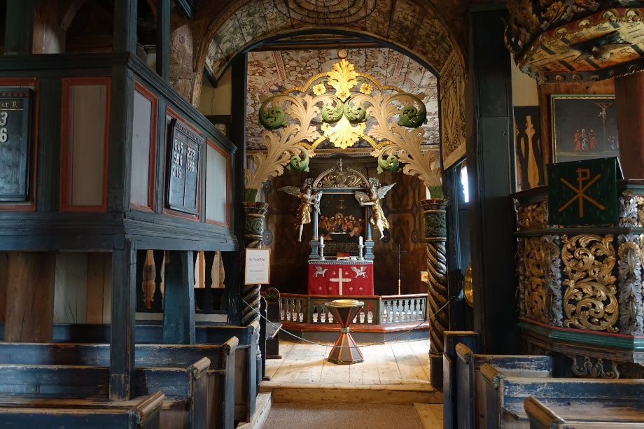 In het centrum van Lom zijn we gestopt bij de oude staafkerk en het interieur uitgebreid bekeken.